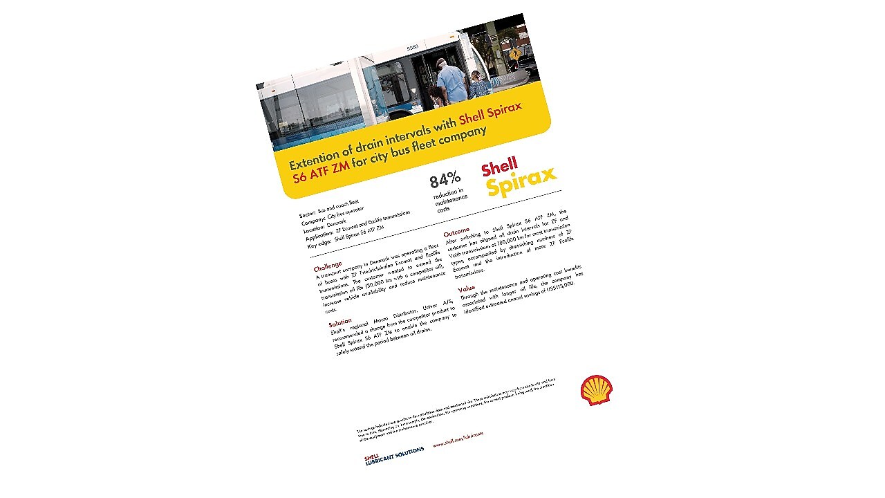 A Danish transport company achieved estimated annual savings of US$113,000 by switching to Shell Spirax S6 ATF ZM, extending oil drain intervals from 30,000 to 180,000 km in ZF and Voith transmissions.
