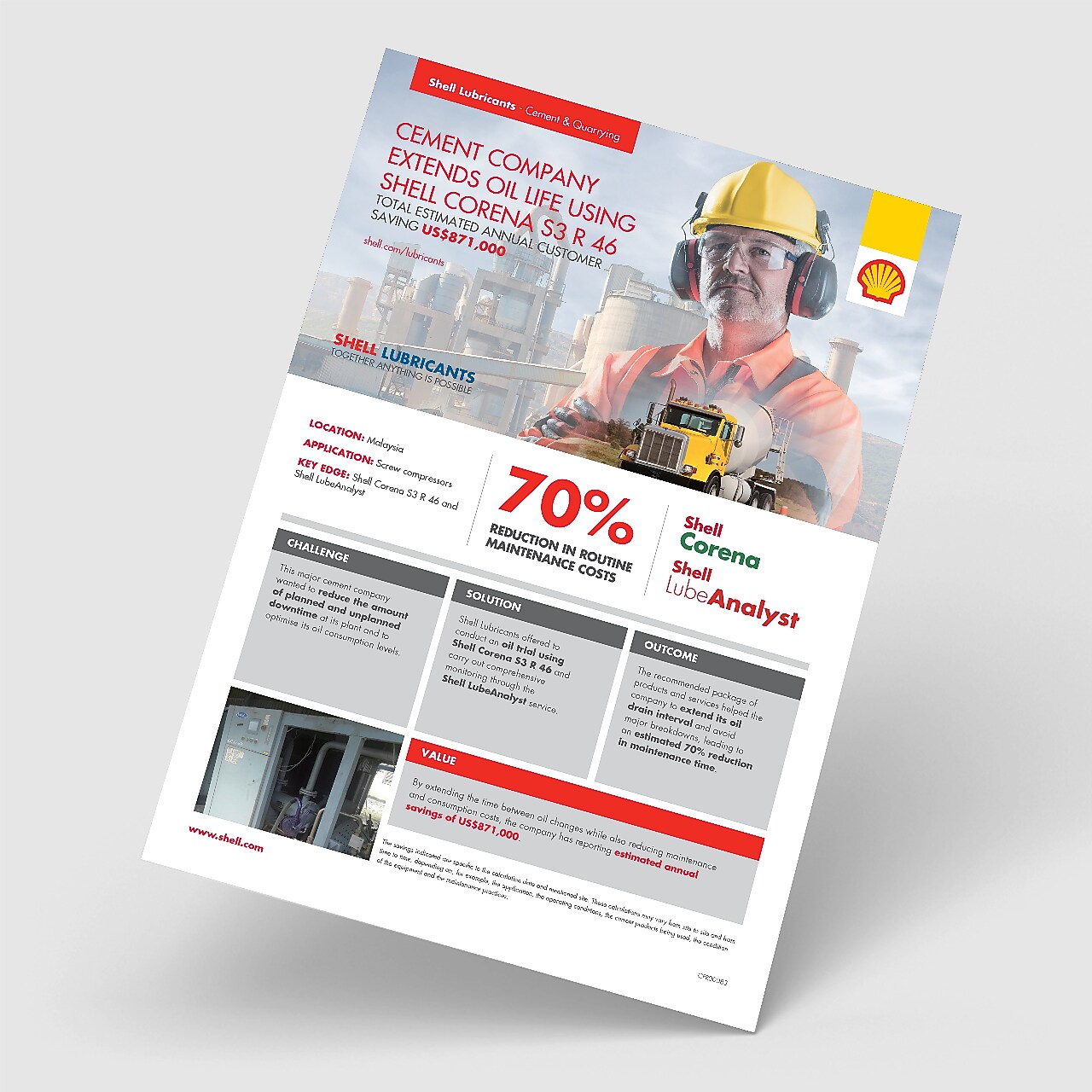 Thanks to a 70% reduction in maintenance time, Shell Corena S3 R 46 helped this cement company to estimated annual savings of $871,000.